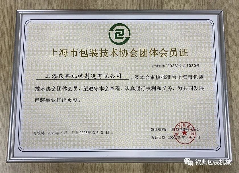 上海欽典機(jī)械制造有限公司正式加入上海包裝技術(shù)協(xié)會